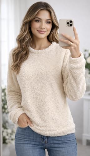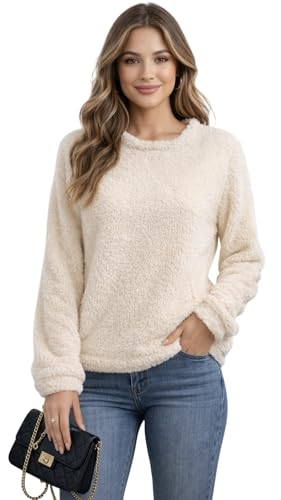 Generic - Women's Fuzzy Fleece Pullover Sweater, Cream, Long Sleeve, Soft Plush Texture, Crew Neck, Casual Loungewear size M