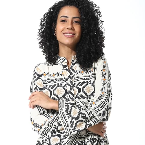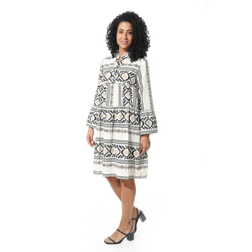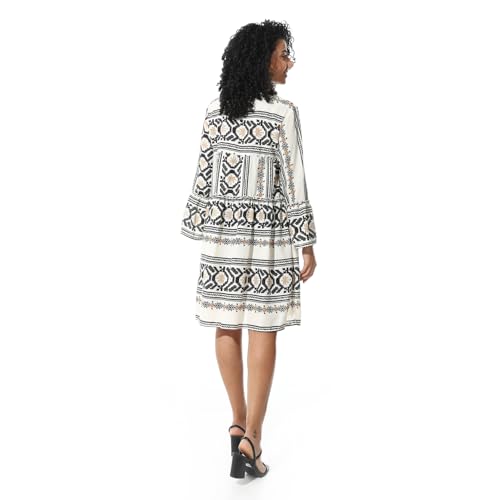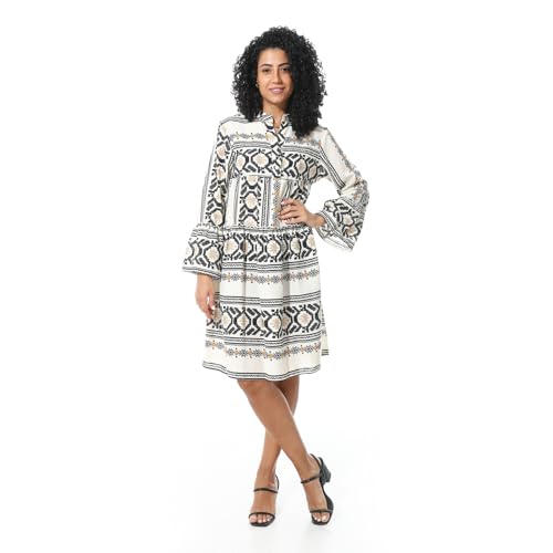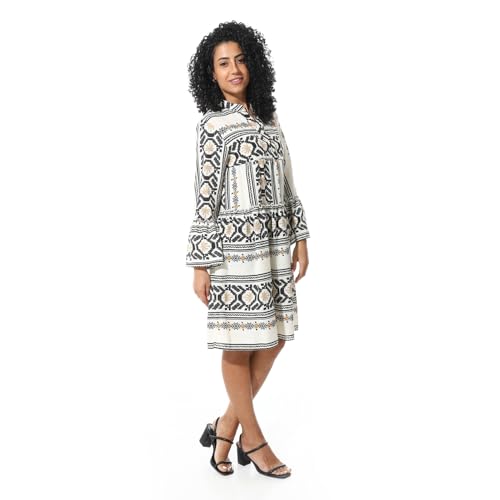 Coctail - فستان متوسط الطول بطباعة هندسية واكمام جرس وتفاصيل مطرزة بالزهور للنساء - 4816