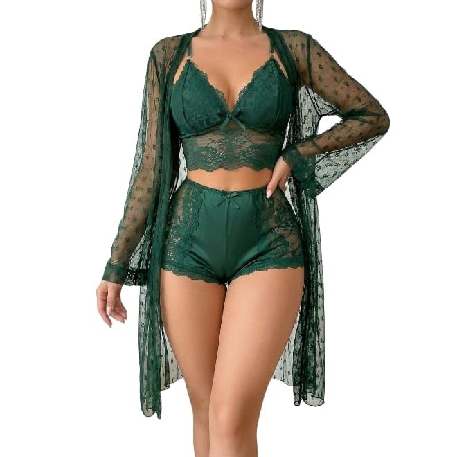 Generic - طقم ملابس داخلية نسائية من الدانتيل الأخضر، 3 قطع مع روب شفاف، مقاس متوسط