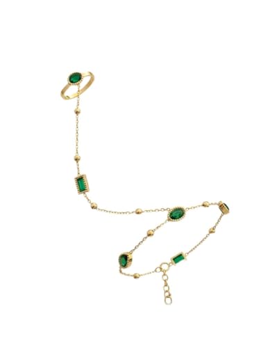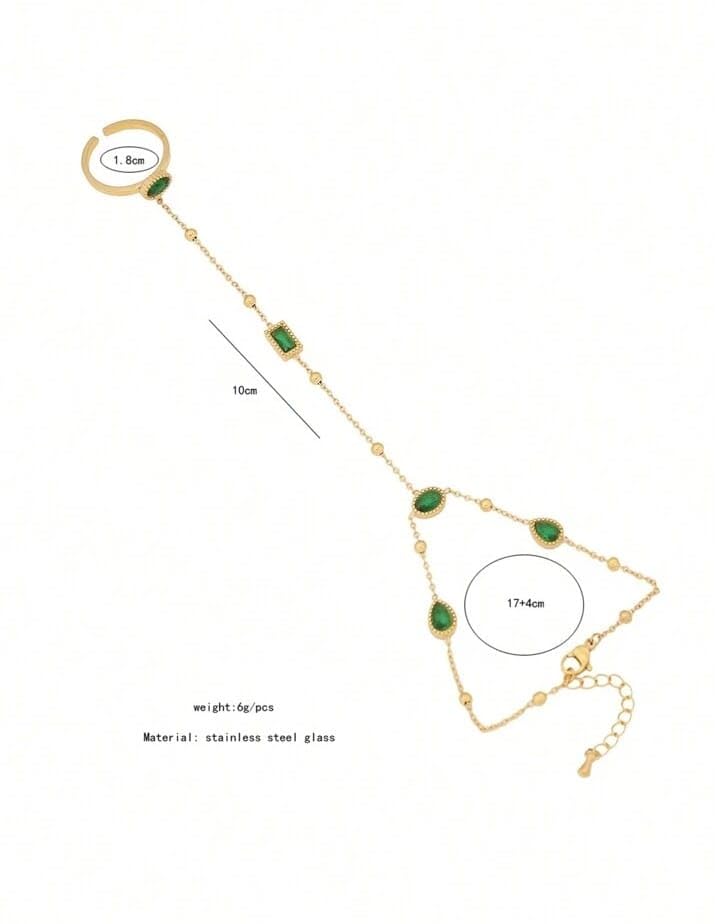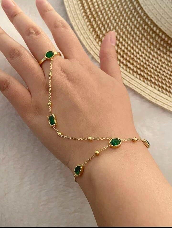 Generic - Women's Hand Bracelet with Stainless Steel Ring, Gold Color with Green Lobes, Rust and Water Resistant