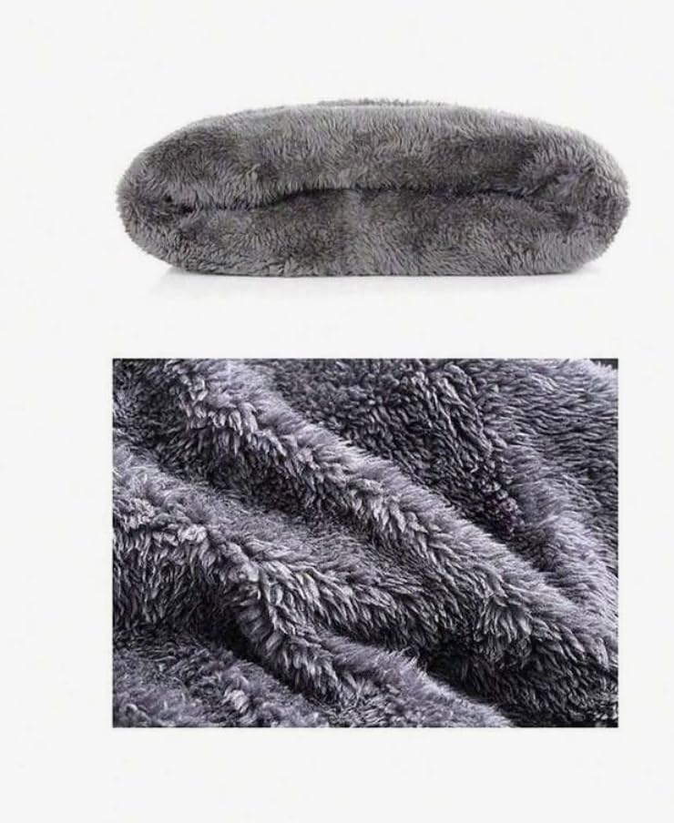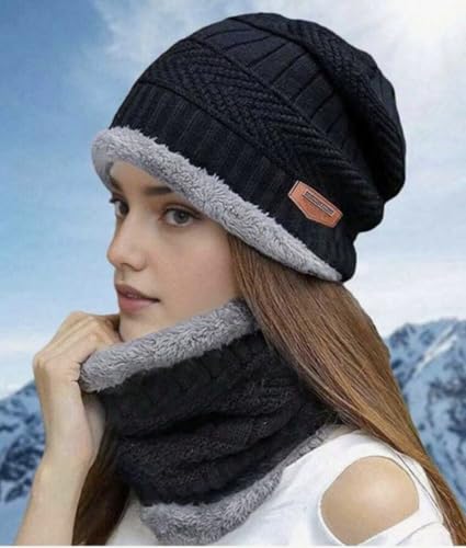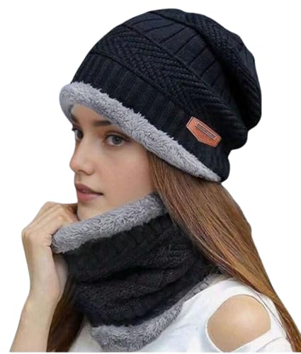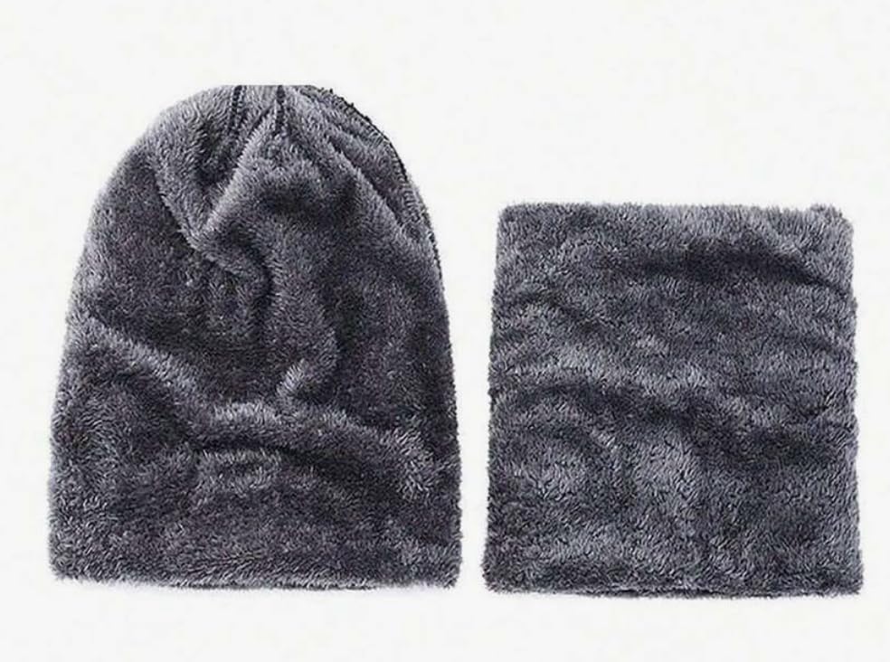 Generic - Women's knitted hat and neck gaiter set, solid color, thermal lined, for autumn/winter, fashionable hat and scarf set, Black&Gray