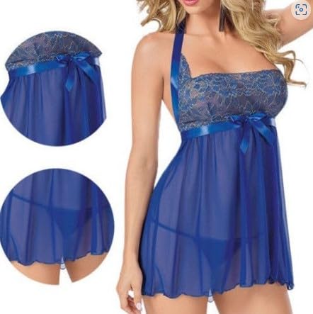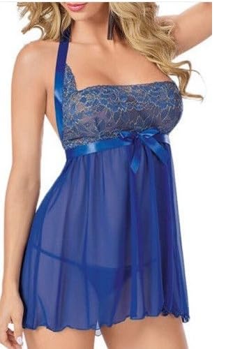 Generic - Women's Lace Babydoll Nightwear, Royal Blue, Sheer Mesh, Halter Neck with Bow