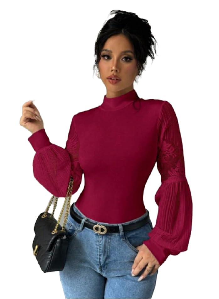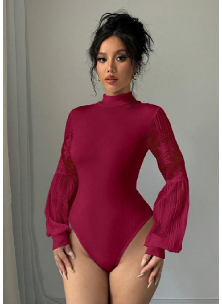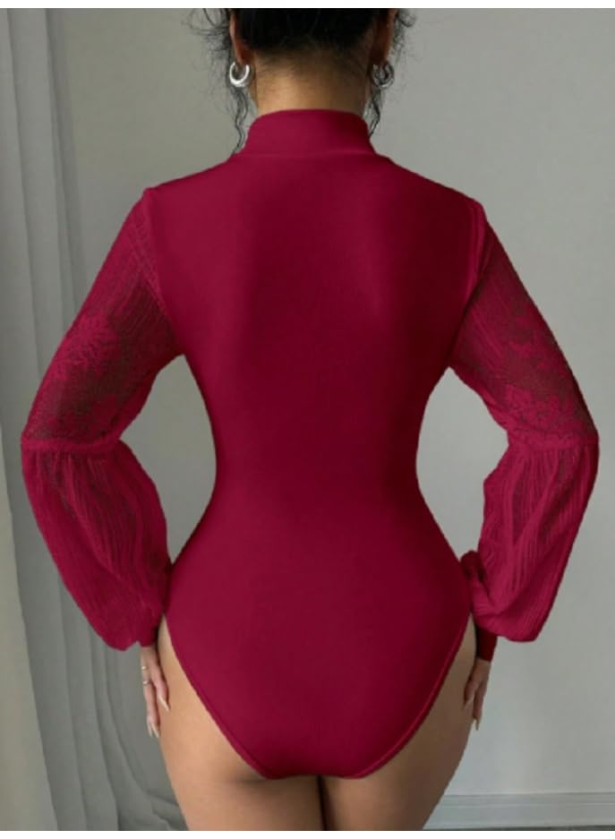 Generic - Women's Lace Patchwork Lantern Sleeve High Neck Bodysuit For Fall Cloth
