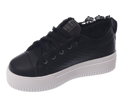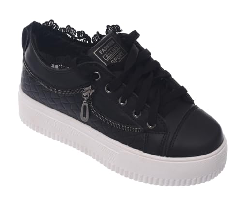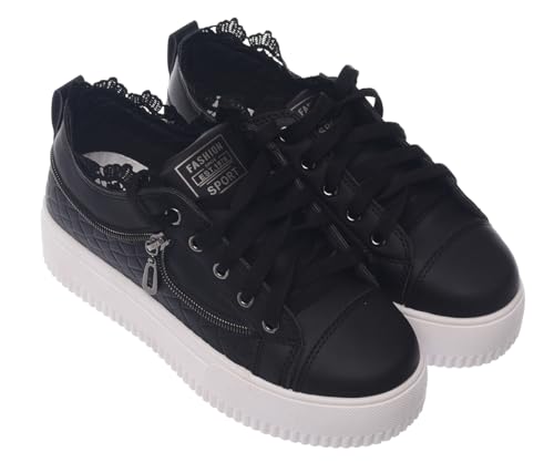 Women's Leather Lace-up Wedge Sneakers with Decorative Side Zippers and Lace-Trimmed Collar (Black, 42)
