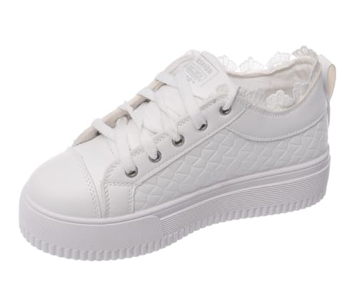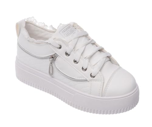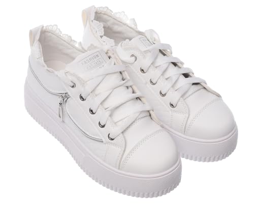 Women's Leather Lace-up Wedge Sneakers with Decorative Side Zippers and Lace-Trimmed Collar (White/Silver, 38)