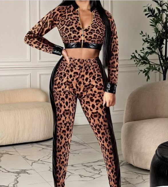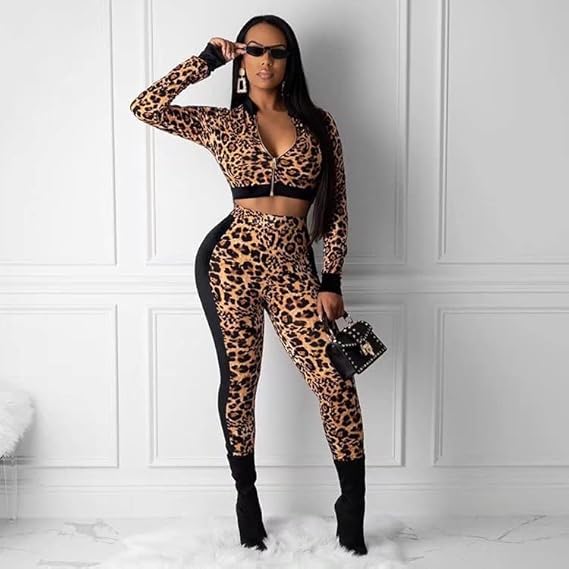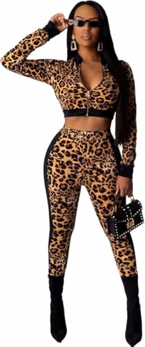 Generic - Women's Leopard Print 2-Piece Activewear Set Zip-Up Crop Top and High-Waist Joggers Black Trim, One Size