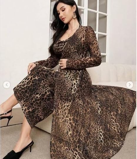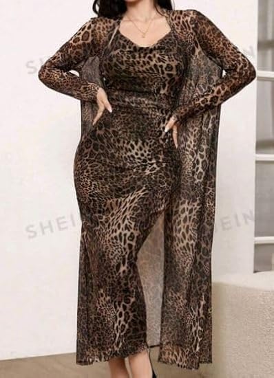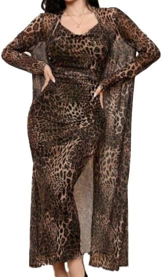 Generic - فستان نسائي بطبعة جلد الفهد مع كارديجان طويل، مقاس كبير، نمط حيوانات بني، طقم من قطعتين