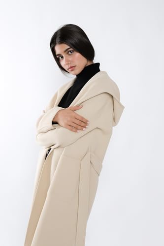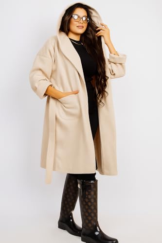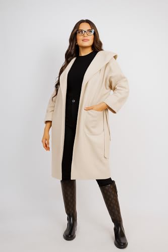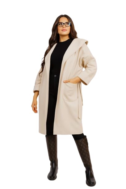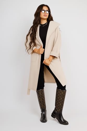 Generic - Women's Long Hooded Wool Look, cream Belted Overcoat, Classic Double-Breasted Design with Pockets, Winter Outerwear,Womens Clothing,Coats & Jackets