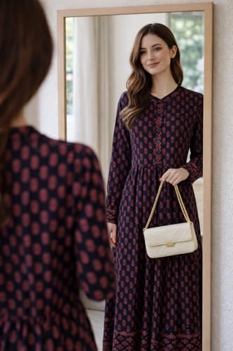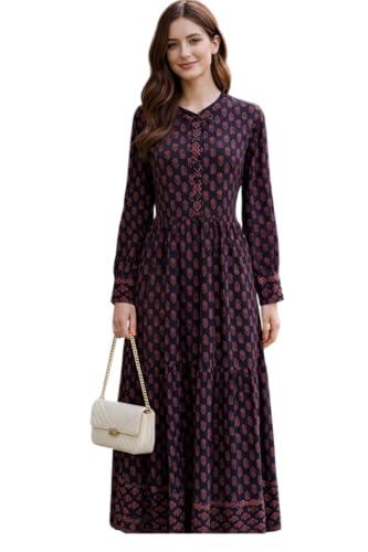 Generic - Women's Long Sleeve Maxi Dress, Navy Blue with Red Paisley Print, Button Front, Tiered Flowy Design size xl