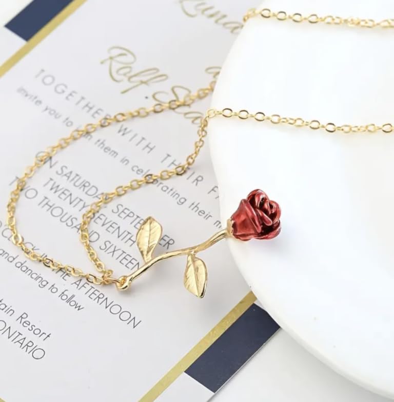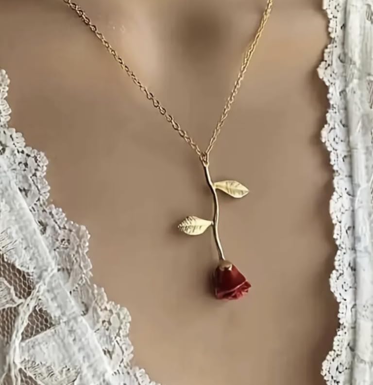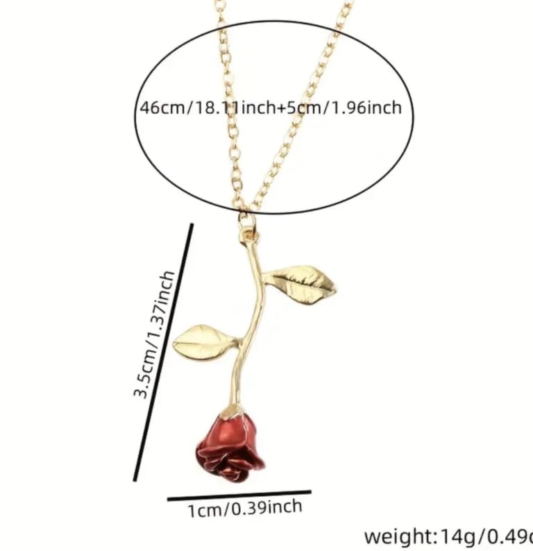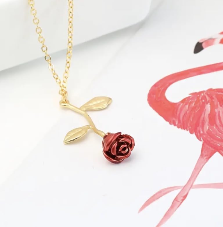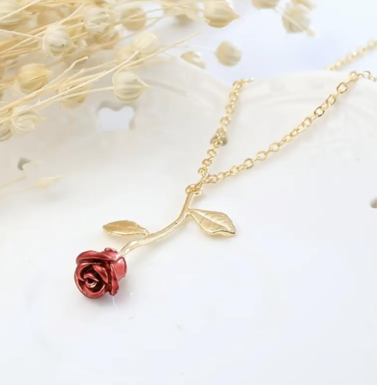 Generic - Women's Minimalist Rose Necklace, Red Floral Pendant with Gold Chain, Elegant Everyday Jewelry, 46cm Length