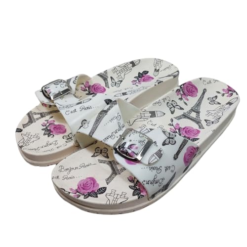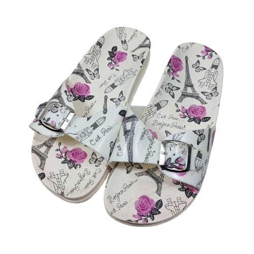 Generic - Women's Paris-Themed Slide Sandals, White with Purple Roses and Eiffel Tower Print, Buckle Closure Size 38 - شبشب حريمي مطاط مريح