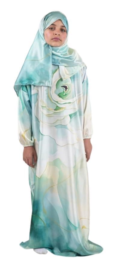 Generic - Women's Prayer Dress with Hijab, Turquoise Floral Print, Long Sleeve Islamic Abaya Set, 8-9 size