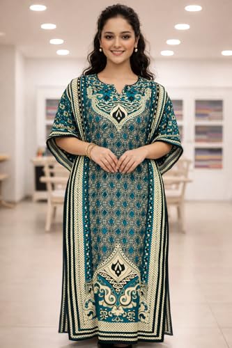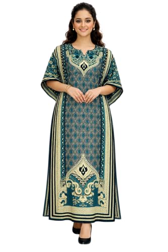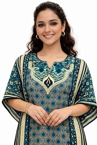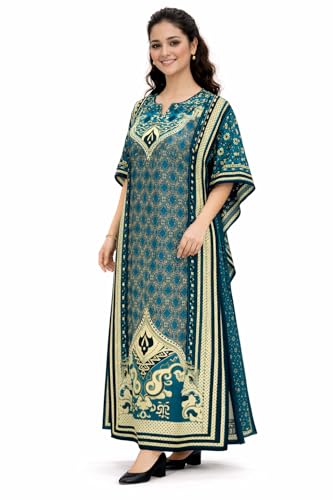 Generic - Women's Printed Kaftan Maxi Dress, turquoise with Black and White Geometric Pattern, Kimono Sleeves, Long Length one size