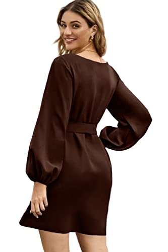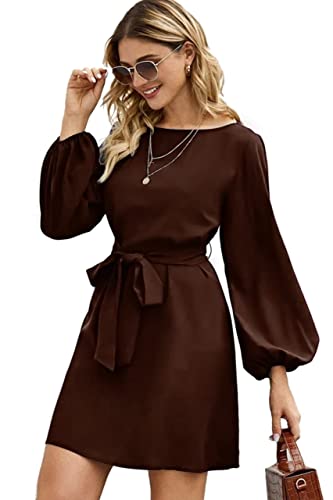 Generic - فستان نسائي قصير بأكمام منفوخة مع حزام خصر، بني، قماش سكوبا