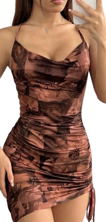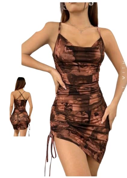 Generic - فستان ضيق قصير مكشكش للنساء، طباعة بنية مصبوغة بالربط، ظهر متقاطع (1011)