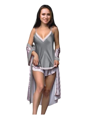 Generic - Women's Satin Pajamas Solid Suspender Top Striped Long Robe and Striped Shorts with Bow Tie Inlaid Lace