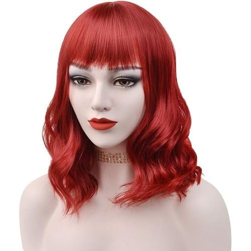 Generic - باروكة شعر نسائية قصيرة بلون أحمر، شعر مستعار مموج مع غرة، طول متوسط