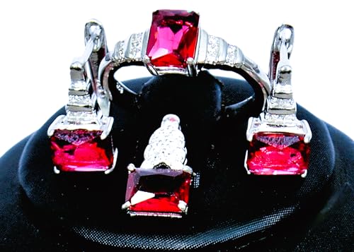 Generic - طقم مجوهرات نسائي من الفضة مع أحجار حمراء، خاتم مقاس 18، وزن 8.81 جرام، يتضمن خاتم وأقراط وقلادة
