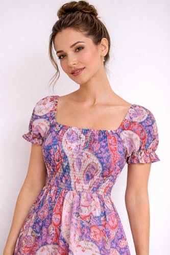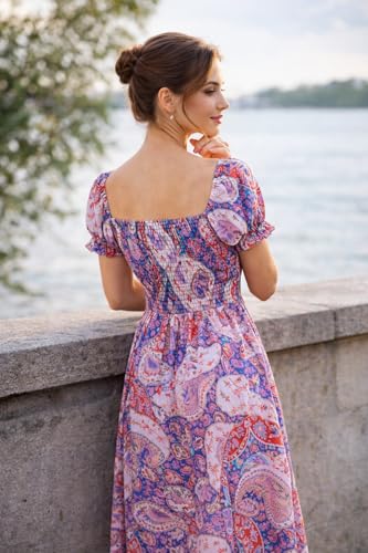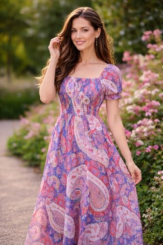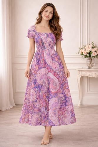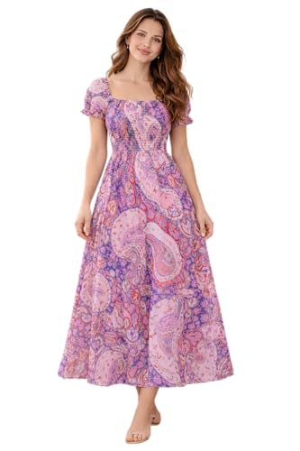 Generic - Women's Smocked Maxi Dress, Purple Pink Paisley Print, Short Puff Sleeves, Square Neck, Flowy A-Line one size