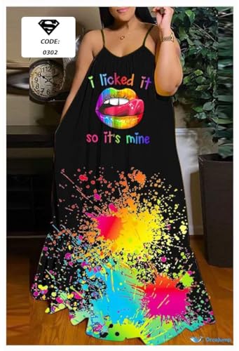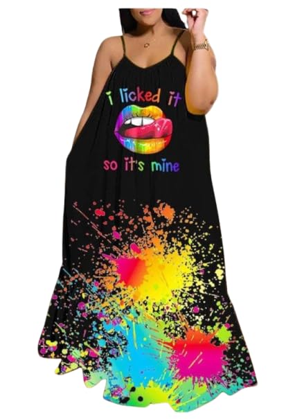 Generic - Women's Spaghetti Straps Long Dress Black with Rainbow Lips Design