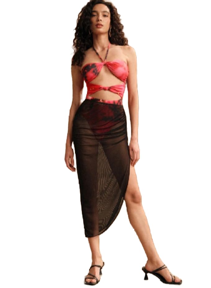 Generic - بدلة سباحة نسائية ماكسي من قطعة واحدة بدون حمالات بطبعة زهور استوائية، ملابس سباحة انيقة ثلاثية الطبقات، مناسبة لعطلة الربيع والصيف على الشاطئ