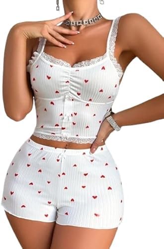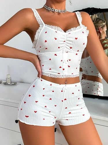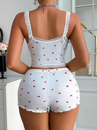 Generic - Women's Two Piece Heart Print Sleeveless Crop Top and Shorts Set, White with Red Hearts, Lace Trim, Ruched Design - طقم نسائي قطعتين، بلوزة قصيرة بطبعة قلب وشورت، مع حواف من الدانتيل وتصميم مجعد