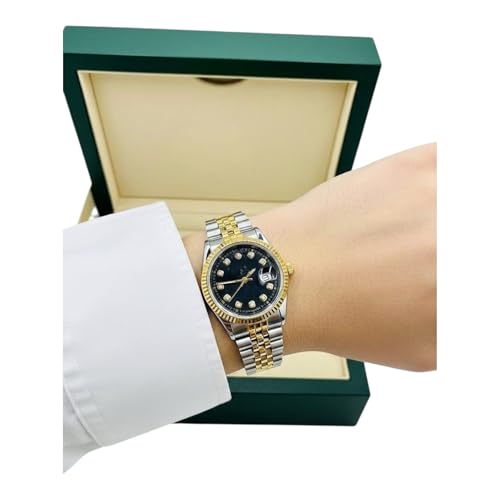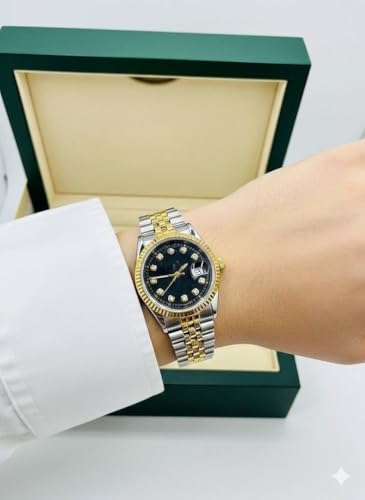 Generic - Women's Watch with Gold and Silver Metal Band, Black Dial with Diamonds, Wave Bezel, Luxury Classic Design
