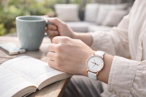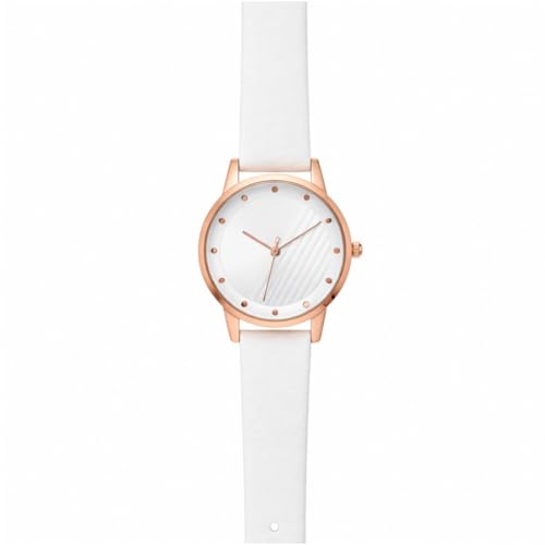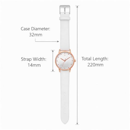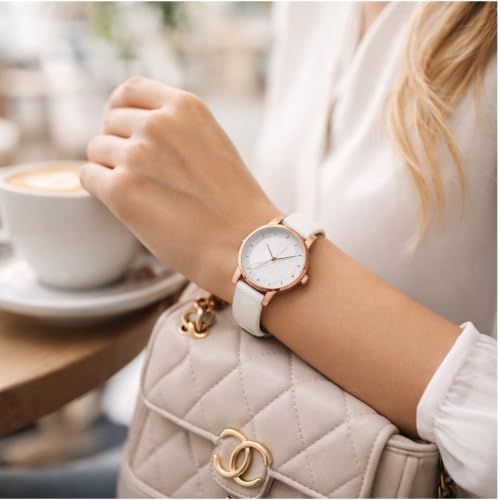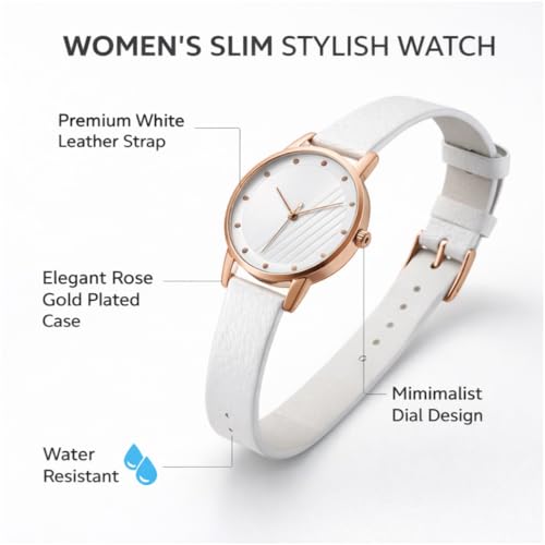 Generic - ساعة يد نسائية بحزام جلدي أبيض، إطار ذهبي وردي، ميناء أبيض بنقوش مخططة