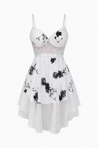 Generic - قميص نوم حريمي شيفون أبيض بطبقات شفافة، دانتيل، طبعة ورود سوداء، تصميم أنثوي ناعم ومريح