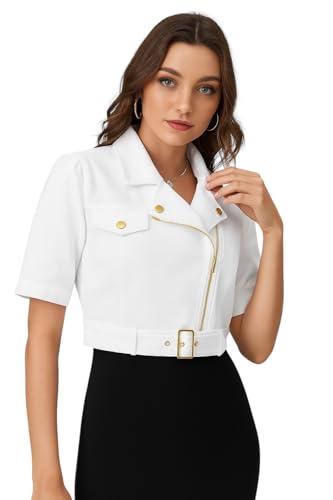 Generic - جاكيت موتو قصير ابيض للنساء مع قطع معدنية ذهبية، كم قصير، حزام خصر مقاس S