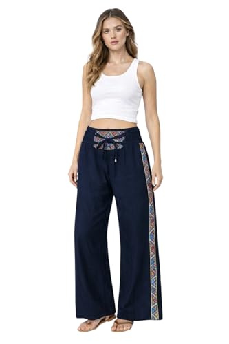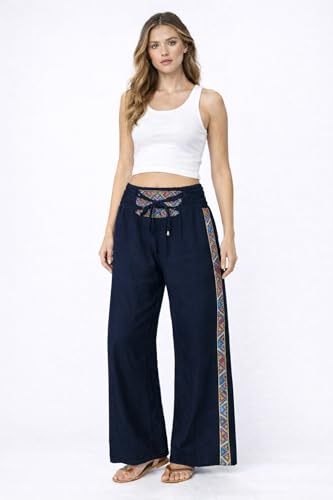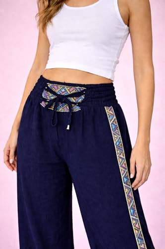 Generic - سروال بالازو بارجل واسعة للنساء، ازرق كحلي مع حواف مطرزة ملونة، خصر برباط سحب، نمط بوهو