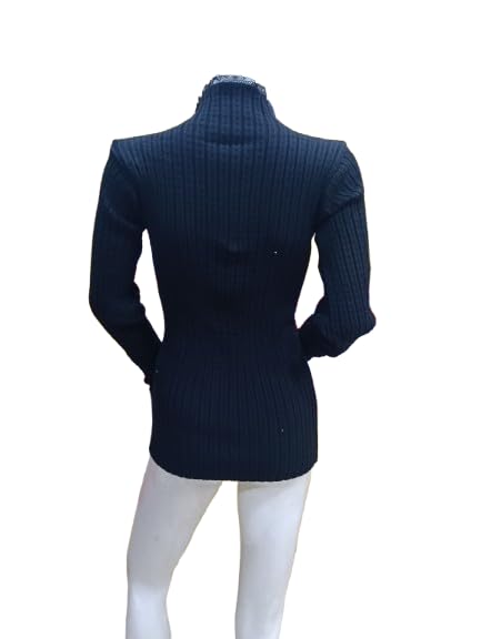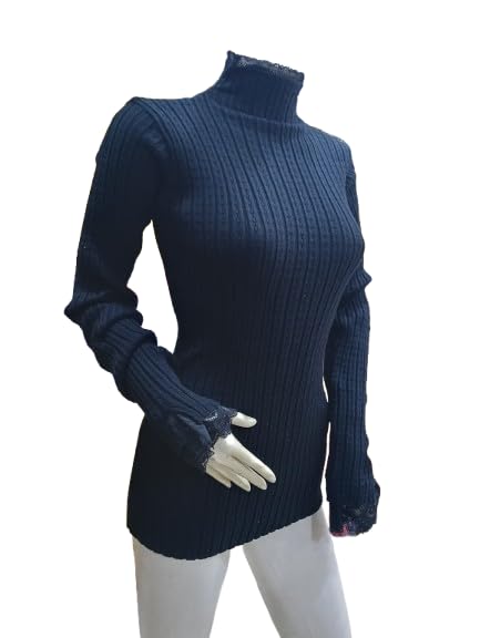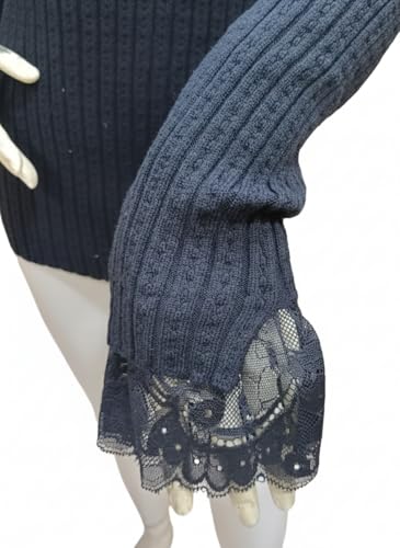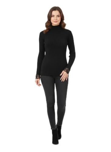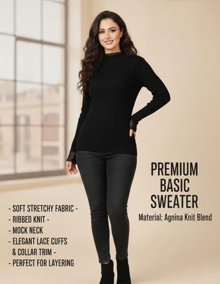 Generic - Women's Winter "Agina" Knit Basic Top – Elegant Floral Lace Trim on Neck & Sleeves – Soft Ribbed Tricot Mock Neck Sweater – Modest Slim-Fit Winter Base Layer