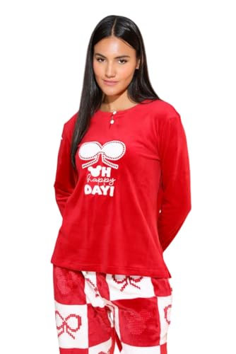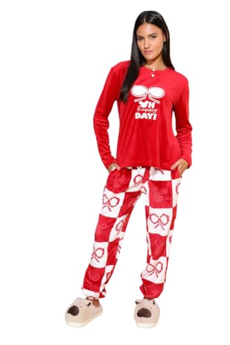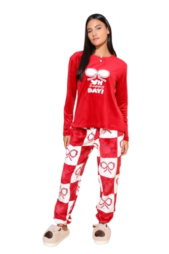 Generic - بيجامة شتوي قطيفة تيشيرت بتصميم شعار وازرار و بنطلون مربعات بتصميم فيونكات للنساء