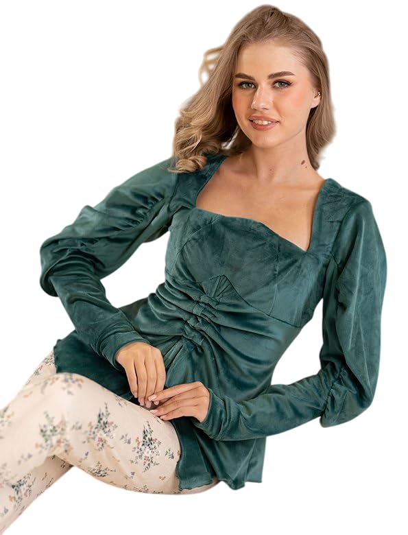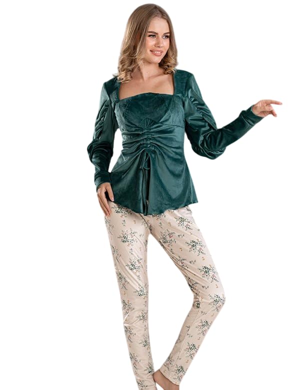 Generic - Women's Winter Velvet Pajamas Thin Blouse And Pants With Pockets Floral Pattern