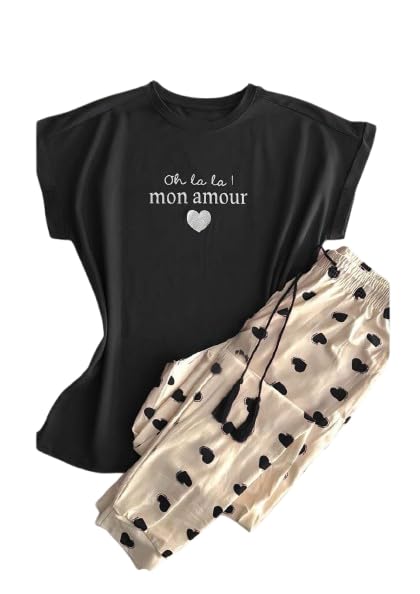Generic - بيجامة صيفي كاجوال قطعتين للنساء مقاس موحد قطن ليكرا كود 14037 لون اسود