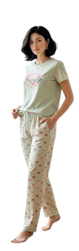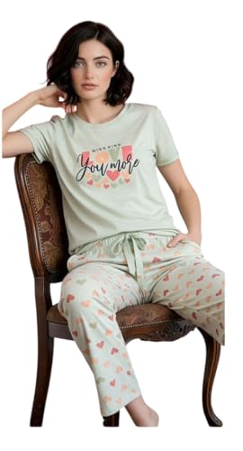 Generic - بيجامة صيفي نص كم تيشيرت بتصميم شعار و بنطلون بتصميم قلوب خامة قطن للنساء