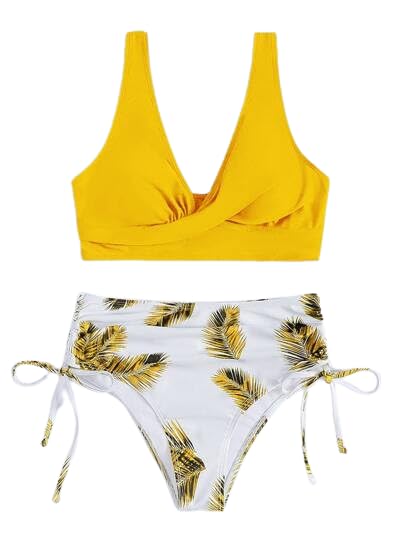 Generic - Women Swim Leaf Print Bikini Set Surplice Tank Bra & Drawstring Side High Waisted Bottom 2 Piece Bathing Suit Summer Beach Clothes