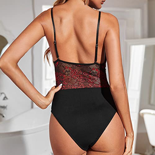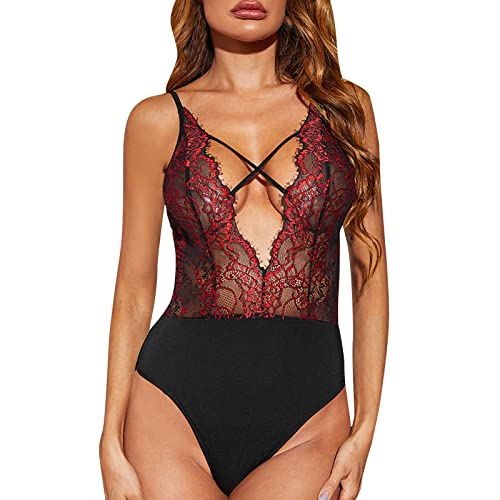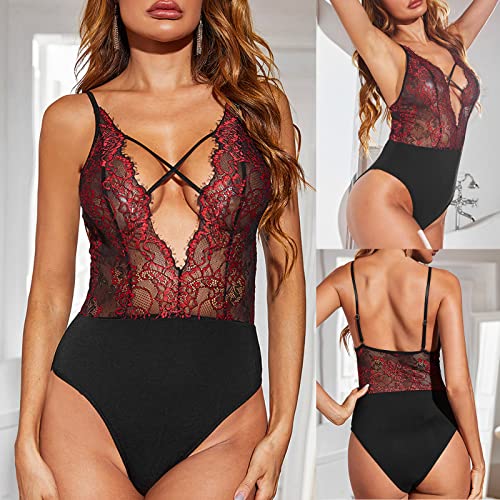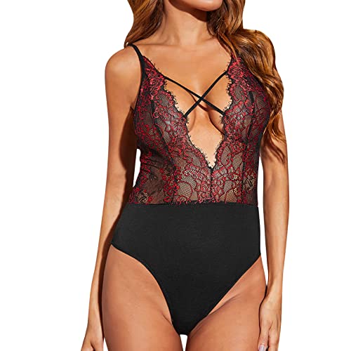 xiongwei - Women V Neck SexyBabydoll Lingerie Lace Backless Lanyard Underwear Conjoined Tight Lace Underwear Vintage Negligee with Stockings for Baby Boomers