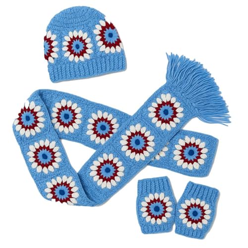 Generic - Women Winter Handmade Hat Gloves Scarf Set Black Sunflower Warm Knitted Accessories Set (Milky)
