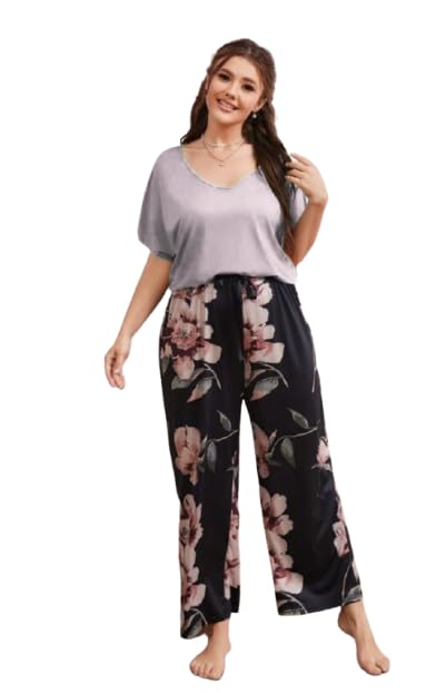 Generic - Womens Summer Chic Plus Size Pajama - Grey T-Shirt & Wide Pants with Colorful Pattern | Comfortable Sleep Set Wear Up to 110k