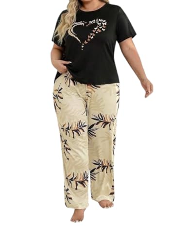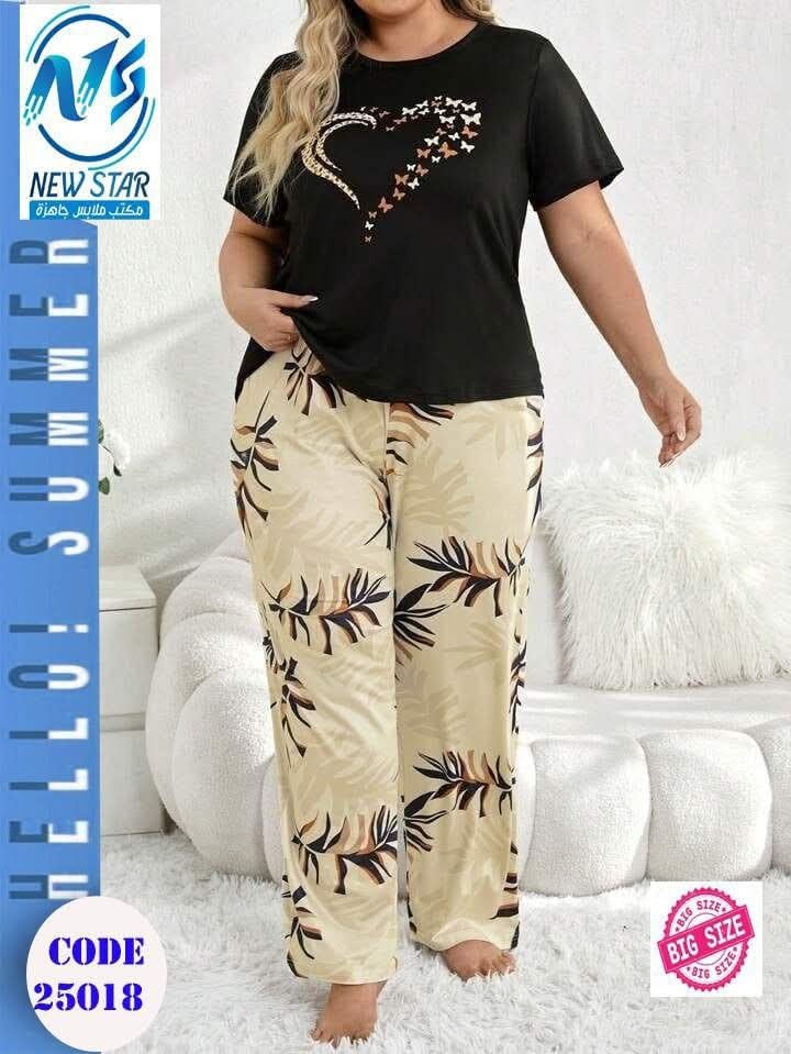 Generic - بيجامة حريمي صيفي مقاس كبير – تيشيرت أسود برسمه قلب وبنطلون واسع | طقم نوم ناعم ومريح يلبس حتى 85كيلو