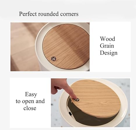 - ✅【FIRM & CONVENIENT】:Our trash bin features a durable internal pressure ring that can firmly hold the litter bag, preventing it from falling or tipping. Now you can easily put on or replace litter bags with great comfort with the carefully designed and easy-to-use interior gasket Its round design featuring faux wood with a smooth finish and no rough edges promotes easy cleaning and lasting use.