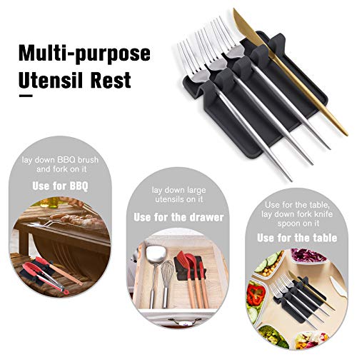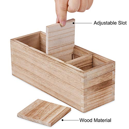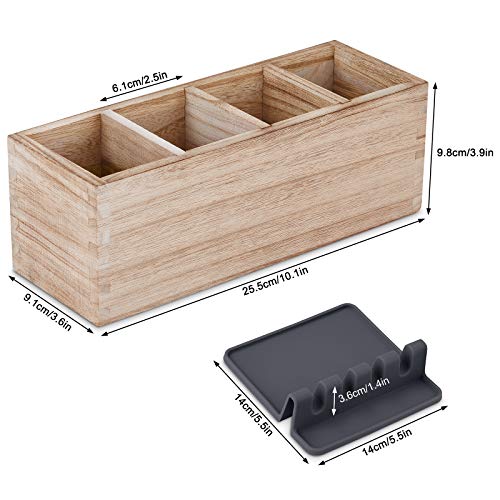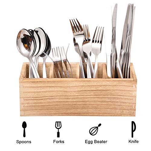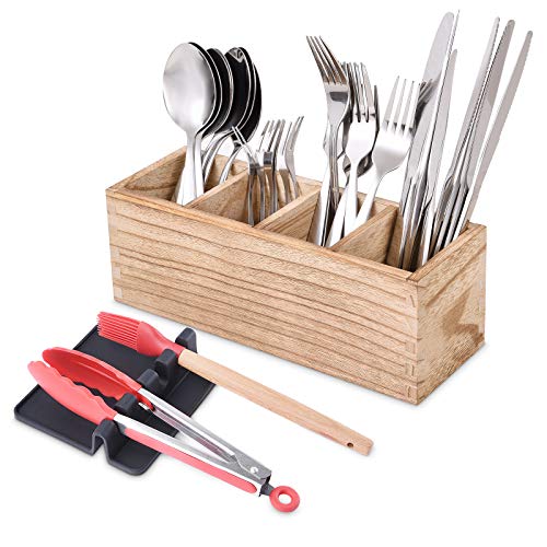 WuGeShop - منظم أدوات المائدة الخشبي مع حامل ملعقة سيليكون، يحتوي على 4 أقسام لحفظ أدوات المطبخ مع فاصل قابل للإزالة، منظم للسكاكين والملاعق والشوك وغيرها، 1 قطعة