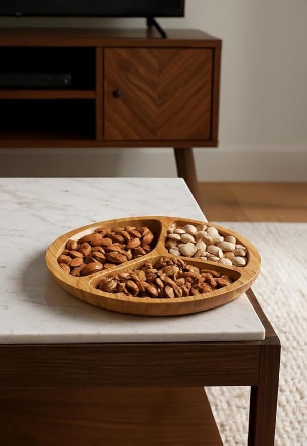 - VERSATILE DESIGN: Round serving plate with divided sections perfect for organising and serving nuts, snacks, appetisers, and various food items in an elegant presentation