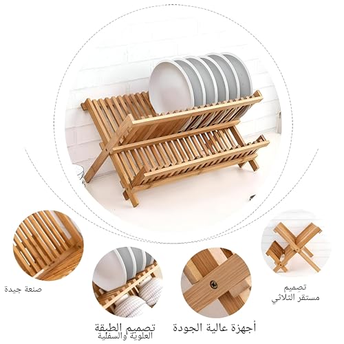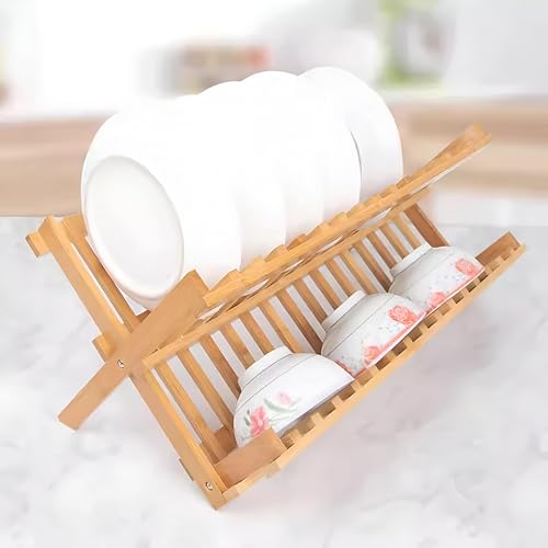 - Change out your kitchen experience with this beautiful bamboo dish rack! This two-ply foldable shelf is not just a kitchen accessory; it changes game rules for your worktop. No more mess and welcome efficiency with smart design increases drying space. The top layer allows bowls to dry while the cups and bowls sit comfortably beneath them, ensuring your kitchen stays organized and functional.