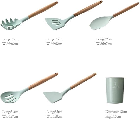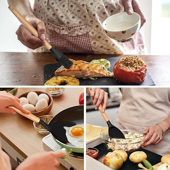 Generic - Wooden and silicone cooking utensils for non-stick cookware with non-toxic bamboo handles, consisting of a food stirrer, tongs, spatula, and spoon, 12 pieces (black)