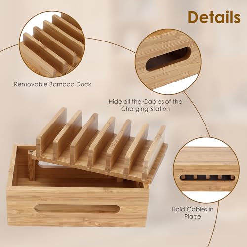 Buachois - Wooden Charging Station for Multiple Devices 6 Ports, Universal Charging Station Docking Station Organizer Multi-USB Charger Compatible with Phone, Tablet, Watch, Earphone