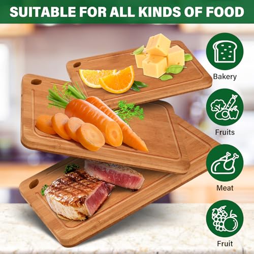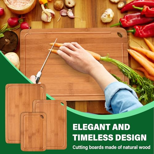 - VERSATILE WOODEN CHOPPING BOARDS SET - This set includes 3 different sized wooden cutting boards: large (38x25x1.8cm), medium (30.5x20.5x1.8cm) and small (23x15x1.8cm), perfect for every kitchen need. Ideal for cutting meat, vegetables, fruits and bread, these wooden kitchen boards always offer the right size for every recipe.