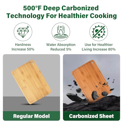 - Bamboo chopping board with heat treatment: Our bamboo kitchen chopping boards undergo professional carbonization at 260°C to improve stability and reduce water absorption. The result? A durable bamboo chopping board with a stylish dark finish, perfect for any type of kitchen.