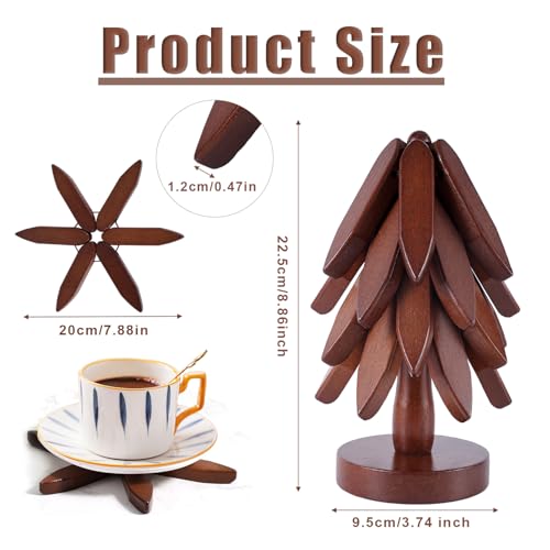 - Contents & Size: You will receive 1 set of wooden coasters for hot pots and pans, consisting of a storage base and 4 coasters in the shape of a tree. The wooden base is about 22.5 x 9.5 cm, the coaster is about 20 cm in diameter and the thickness is about 1.2 cm, protecting your countertop from hot pans.